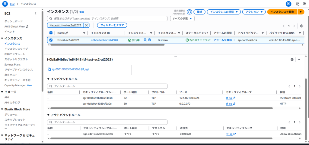 外部からSSH接続する場合は、SGのinboundで”172.16.0.0/16″のフィルタリングしているため、設定を変更する必要があります。