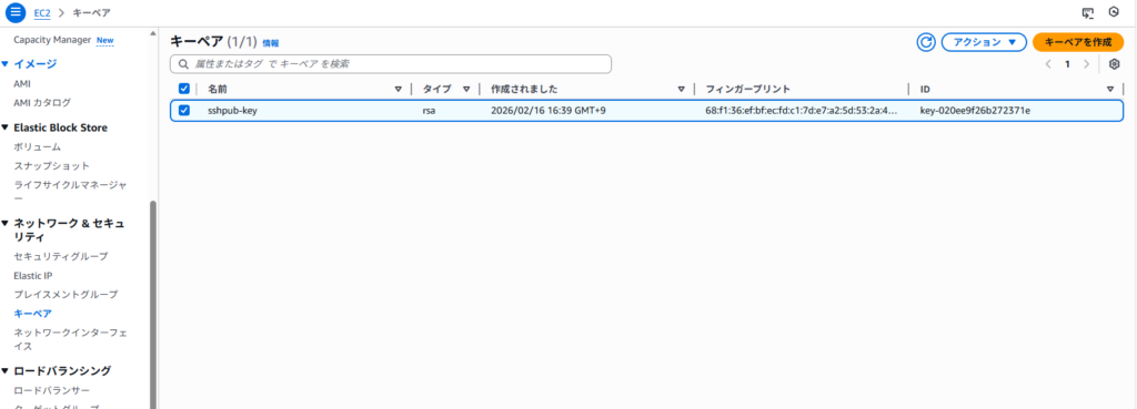 インターネット経由でEC2インスタンスに乗り込めるようにSSH用の公開鍵を作成しておきます。